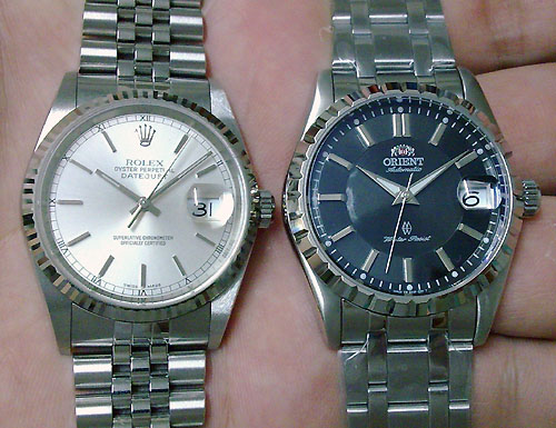 The Orient uses similar styled watch case and crown to create the “lookalike” factor. The other parts of the watch including dial, hands, bezel and bracelet are completely different as you can see in the picture above.