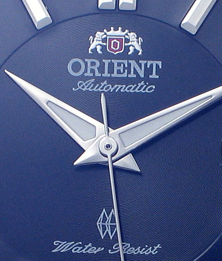 Below is a close up shot of the dial. It is textured at the centre and has the Orient logo and Sapphire crystal symbol on it. The watch uses sword hands similar to those of the Grand Seiko.