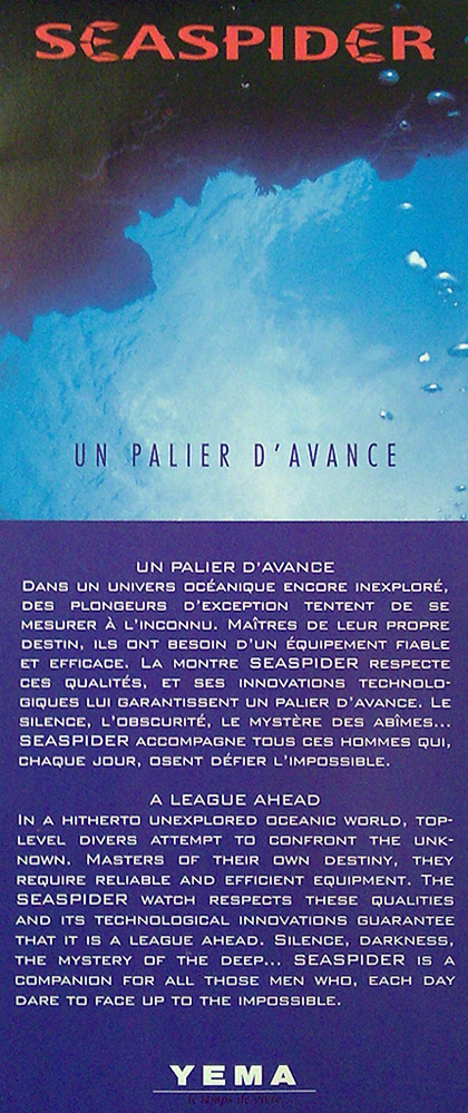 Below are a few images taken from an old YEMA catalog that featured the Sea Spider. The catalog dates back to year 2000 and contains some marketing literature on the watch.
