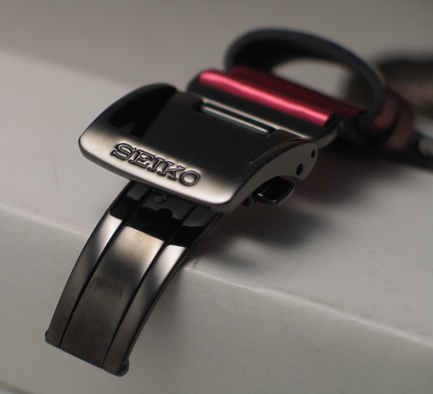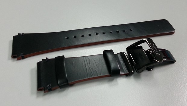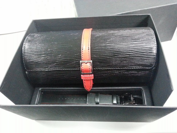 There is also an additional black coloured strap similar to the red one. There are two folding buckles, one on each strap.
