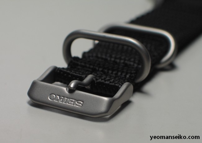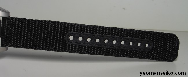 This model comes with a black nylon strap with steel hardware. Below are some pictures of the strap.
