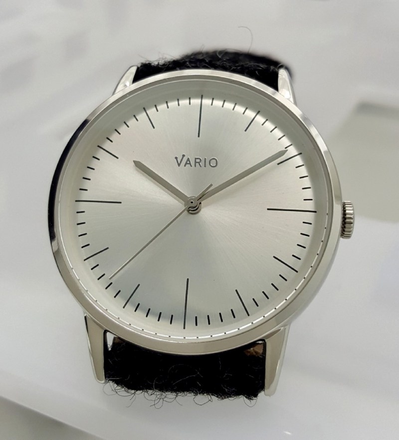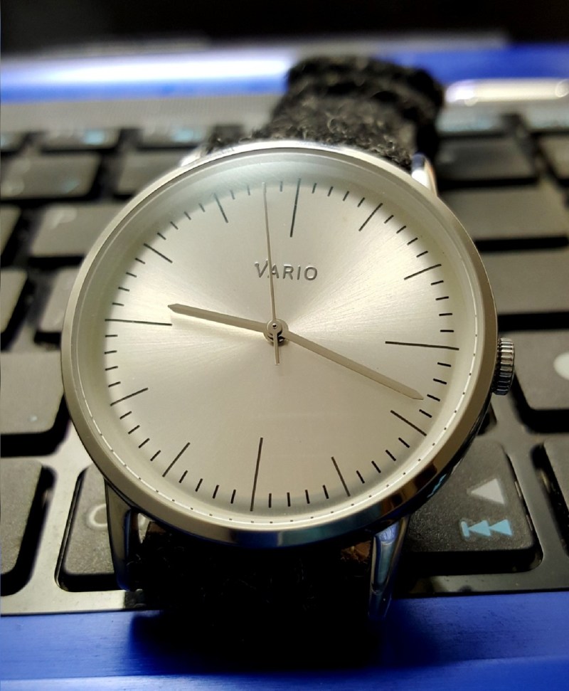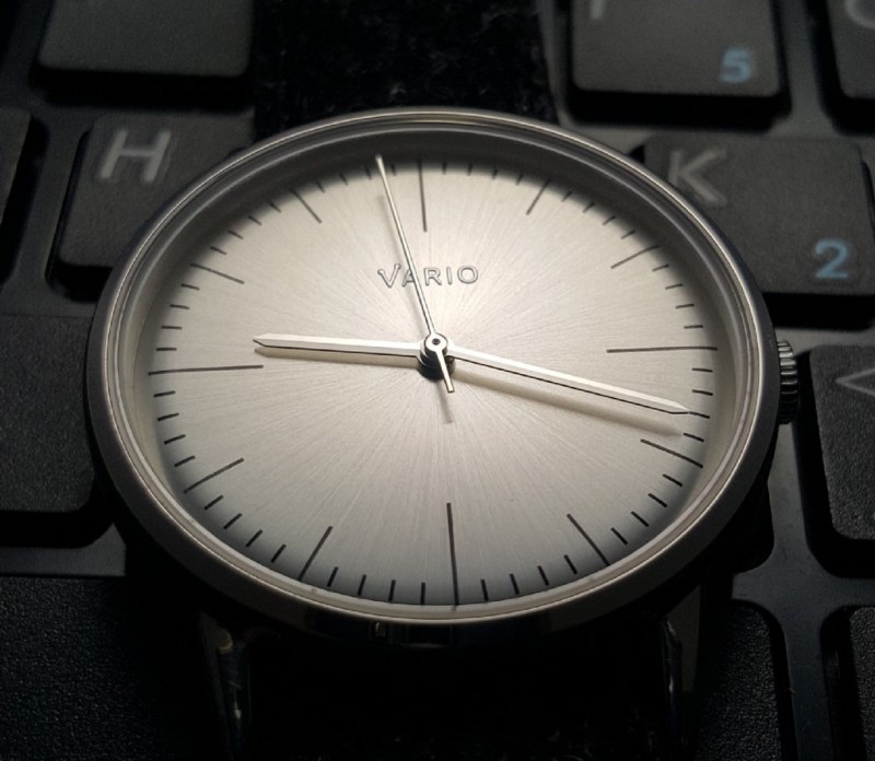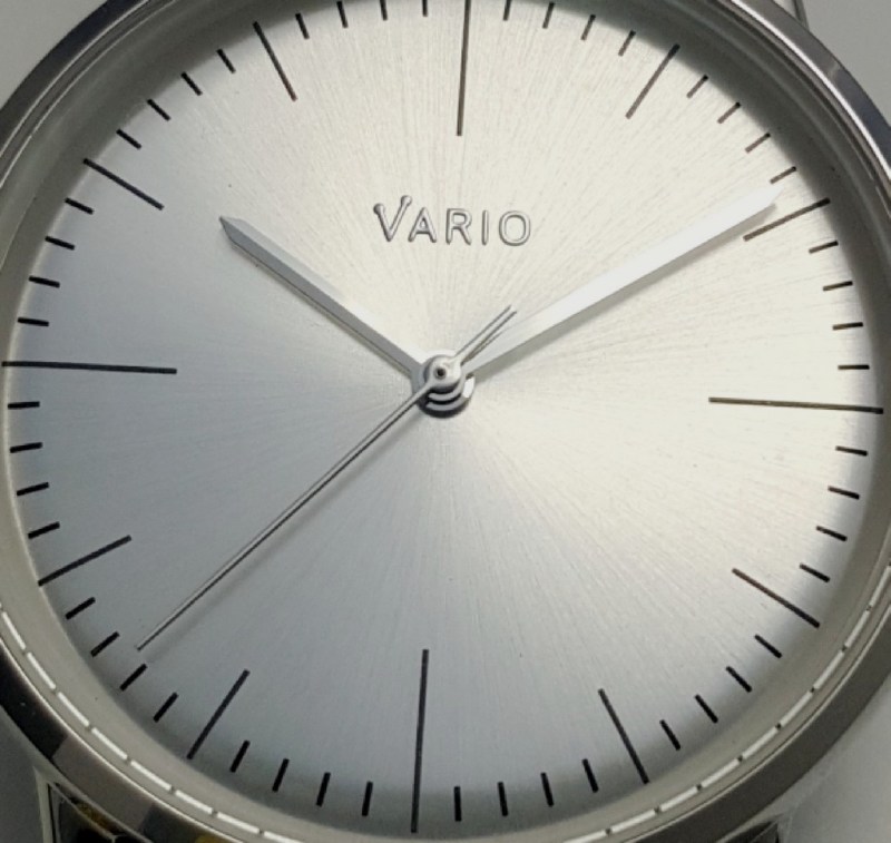 The dial design is pretty simple with hour and minute markings presented in the form of black lines. The 3, 6, 9 and 12 o’clock markers are longer, making them more prominent than the rest. It has sunburst texture and the only text you see is its brand “Vario”. The date feature has also been omitted to keep things minimal.