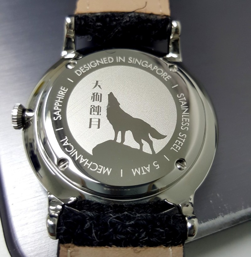 Below are the casebacks of both the quartz and handwind model. They are identical except for the words “Mechanical” and “Quartz”. Both casebacks feature the design of the legendary hound, accompanied by the Chinese characters “天狗蝕月” (pronounced as “tian gou shi yue” in Chinese) which means “heavenly dog ate the moon”.