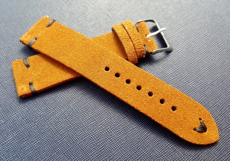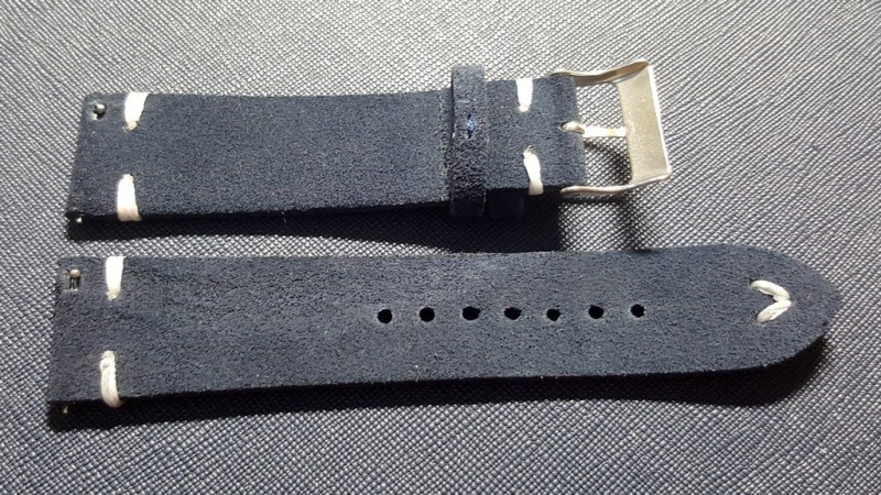 The long end measures 120mm long and the short end is 80mm excluding buckle. It is 3mm thick throughout. Since the strap is handmade, the length may vary slightly on different pieces. It is also interesting to note that the strap has a one-piece fold over construction with the front and back having the same suede leather.