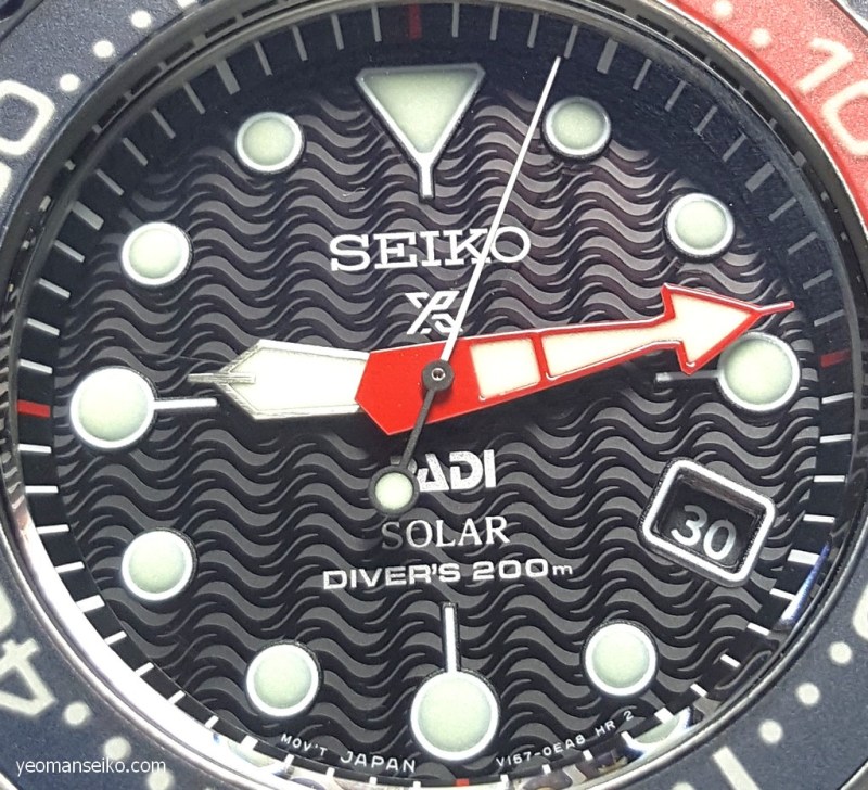 This solar shrouded diver is probably the smallest among Seiko’s family of shrouded divers. However, it has most of the attributes that a shrouded diver should have such as a large screw-in crown, wide hour and minute hands, legible dial and obviously a shroud. Although it is not stated on the caseback, I believe the shroud here is made with ceramic or ceramic coated material.