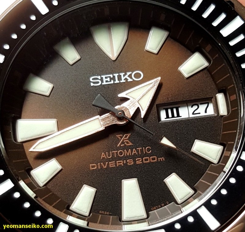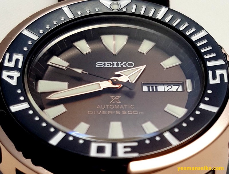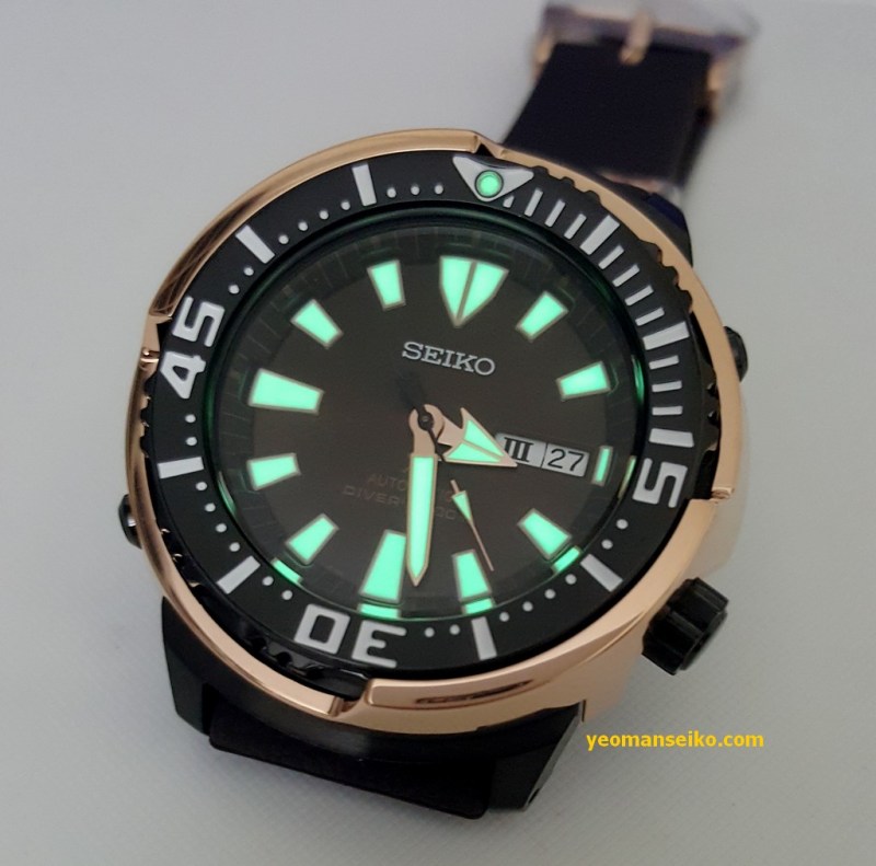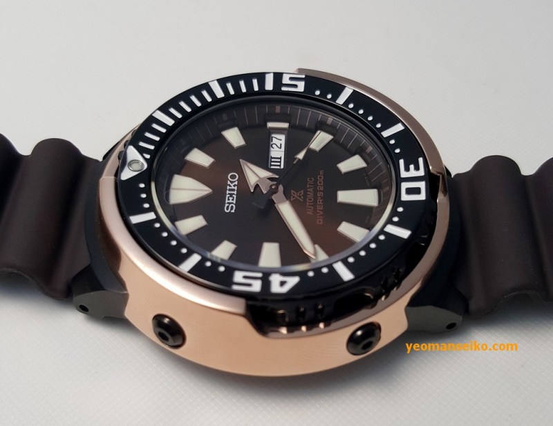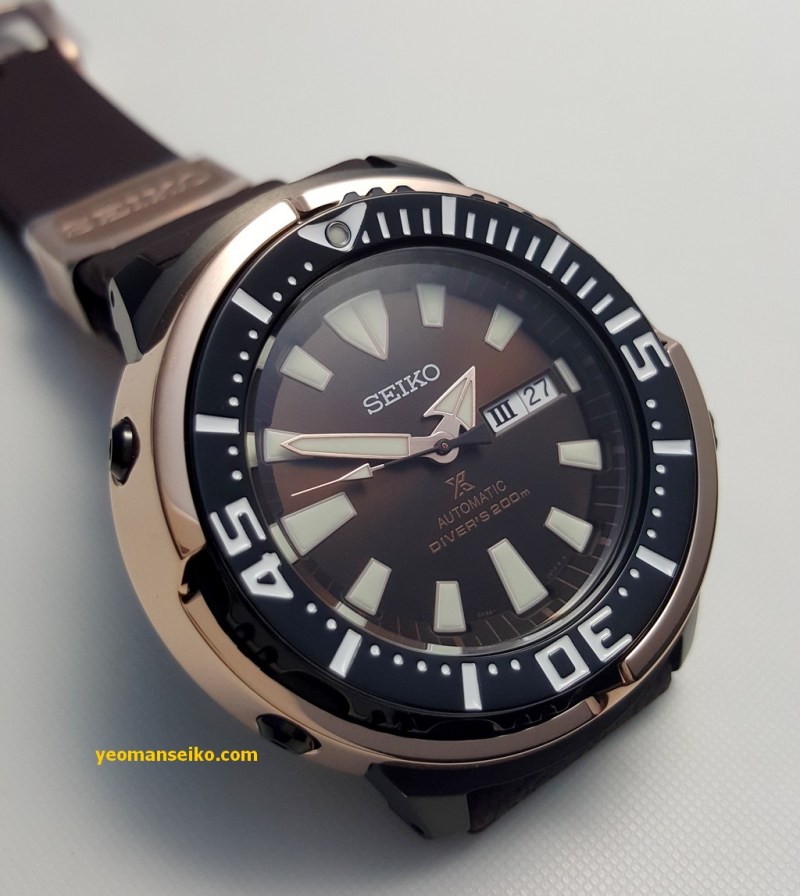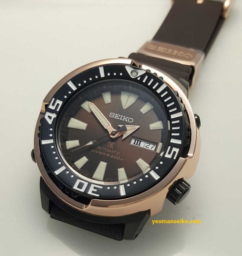 Here are some pictures of the Seiko SRPD14K1, a limited edition diver for the Asian market. It is basically the same watch as the popular SRP637K except it has the colour scheme of the SBDX016 (black case, rose gold shroud, brown dial, black crown and bezel). It is limited to 2200 pieces.