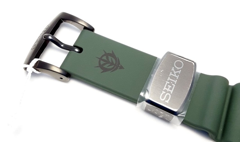 Instead of the “X” logo of the Seiko Prospex, both crowns are signed with a different symbol. I suppose the symbols represent their respective Zaku II robot.