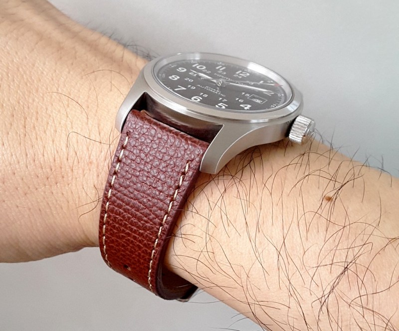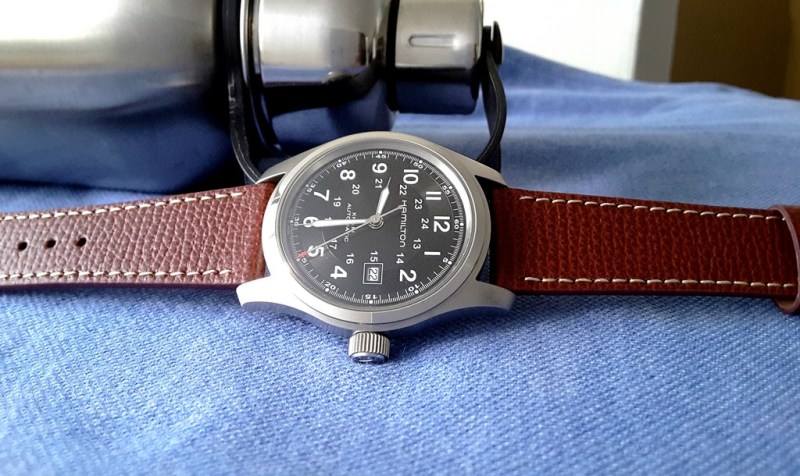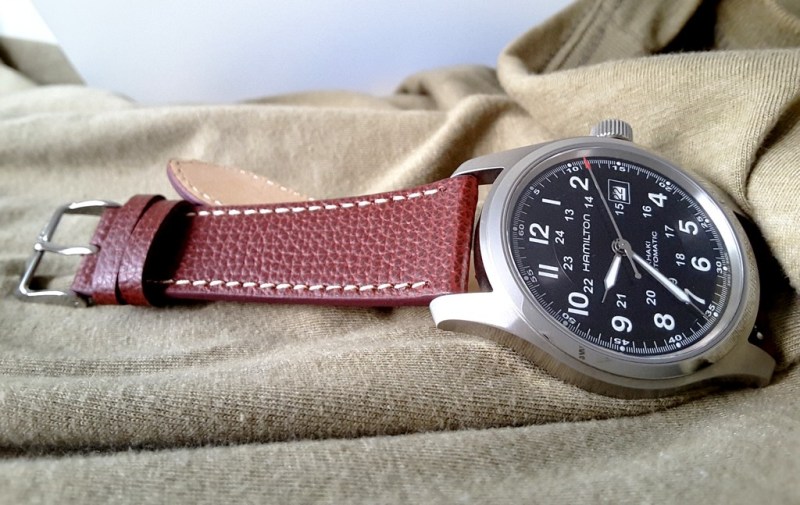 The 22mm brown sample is also very nice and I have it on my Hamilton Khaki Field Automatic. It matches very well with the black dial.