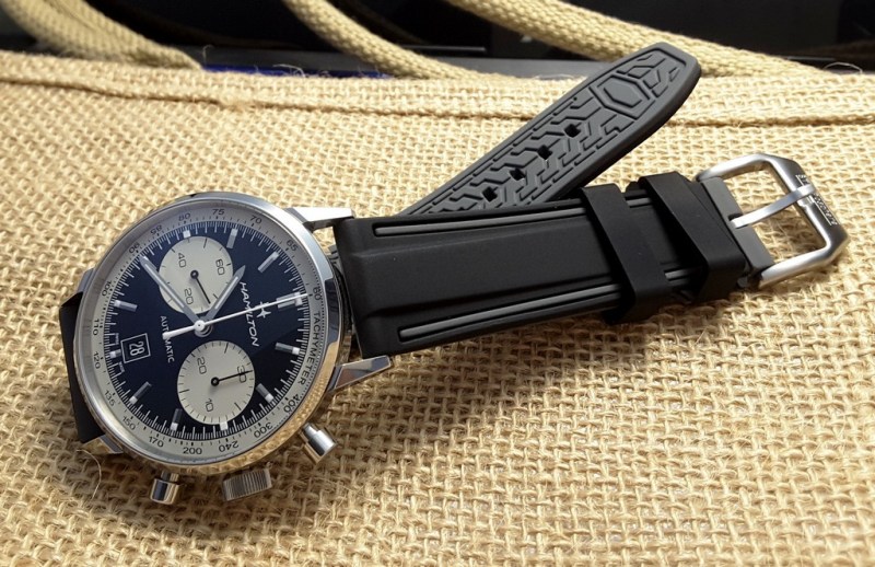 Below are some pictures of the StrapoRACER on my Hamilton Intra-matic 1968. The thickness of the strap makes it strong enough to hold the weight of the chronograph watch.