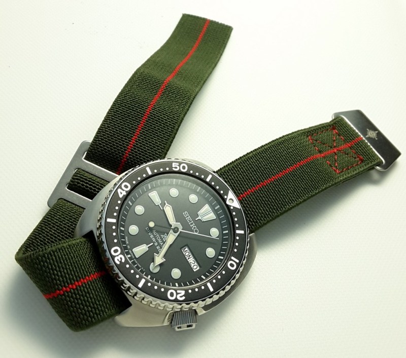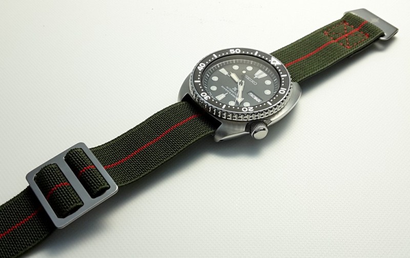 The first strap is the Paratrooper strap which is made with elastic nylon material. There are a number of Marine Nationale inspired straps in the market but this one has a slightly different design. It has a latch at one end and a movable buckle on the body of the strap. The other end of the strap is free instead of being attached to the body by a metal loop.