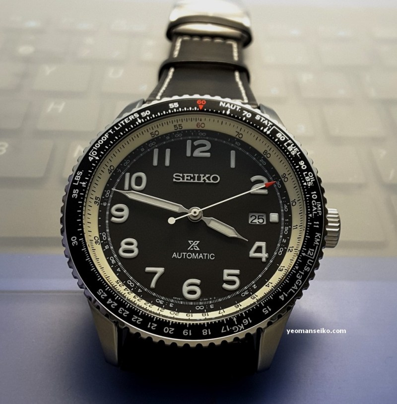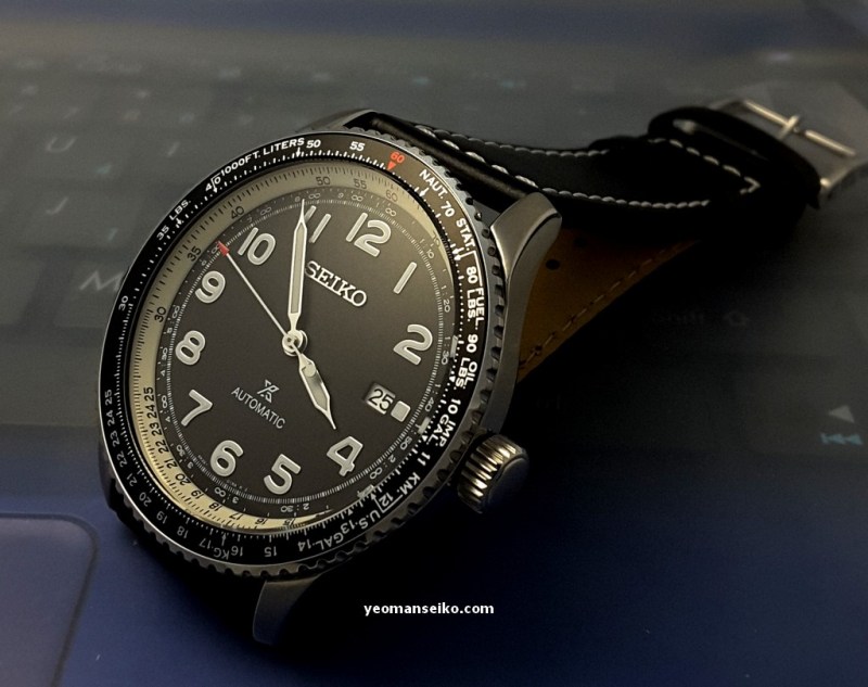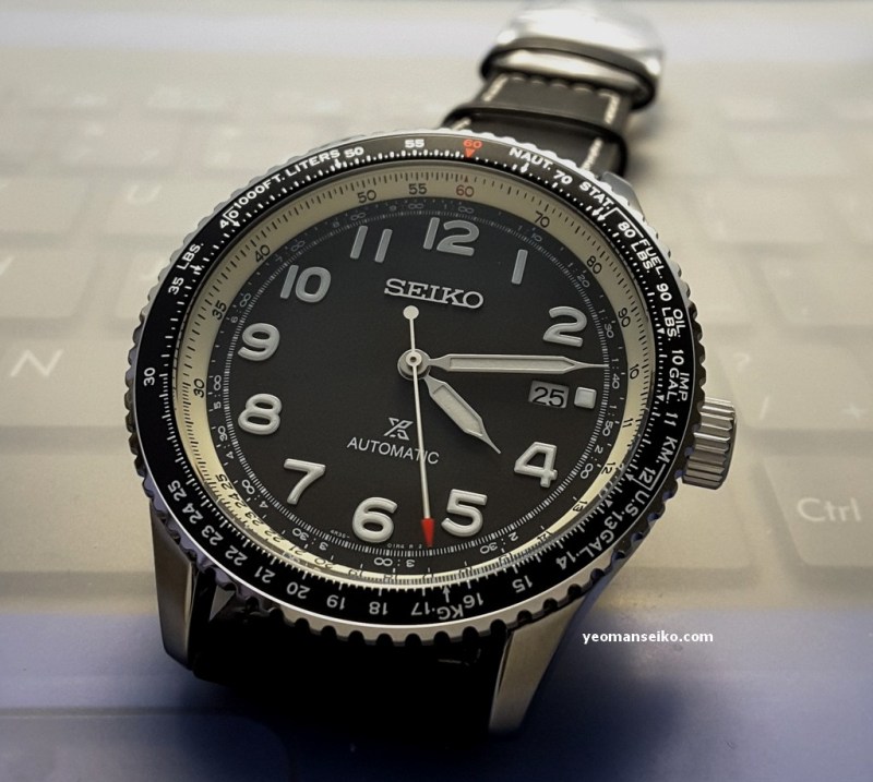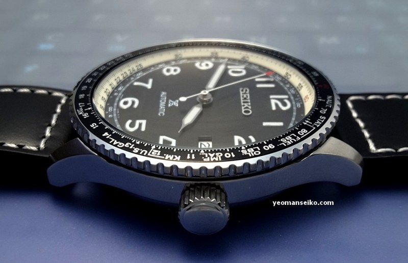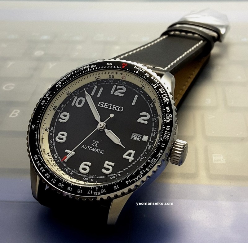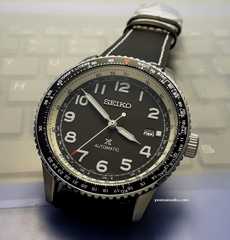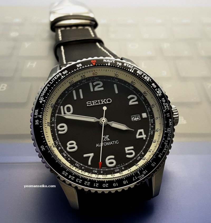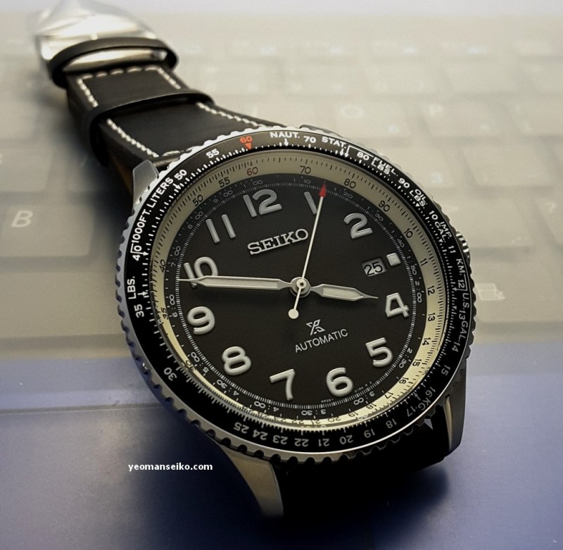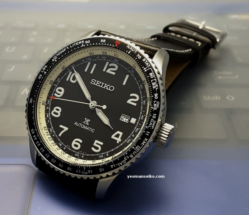 This time round I had the opportunity to handle a “not so new” Seiko Prospex model, the SRPB61K1. This is a 2019 model released under the Prospex Sky sub-brand. It is a pilot style watch that is powered by the 4R35 automatic movement and has a bi-directional rotating slide rule bezel for performing mathematical calculation/conversion during flight. It has a diameter of 44.7mm and uses a curved Hardlex crystal.