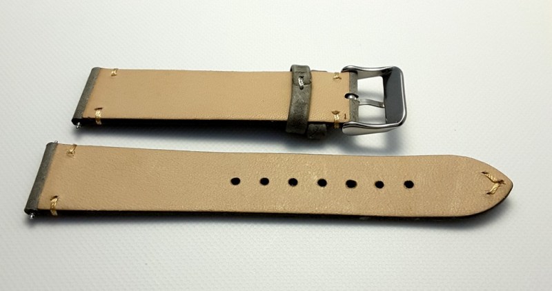 This strap is made from distressed leather that is soft and supple. The surface of the strap is matte finished and has a textured feel similar to that of the suede leather. However, it does not have the raised fibres that you usually see on the suede leather. I find that the distressed surface together with the stitches at the lug ends and tip of the strap give it a unique vintage and aged styling, especially on the grey coloured model.