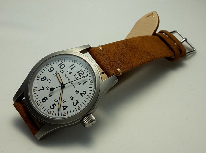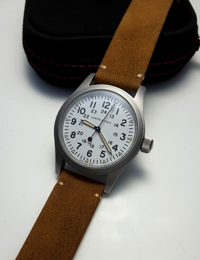 I have these straps installed on my Hamilton Khaki Field Mechanical. This watch is modelled after the military watches made by the company in the 60s. The Strapsco Distressed Leather Strap helps to bring out the ruggedness and vintage feel of the watch.