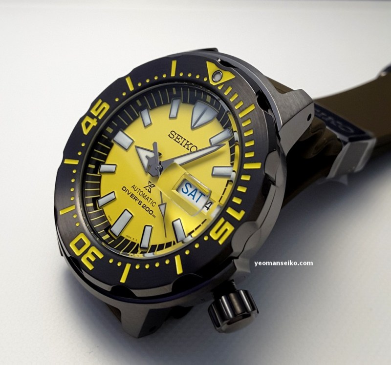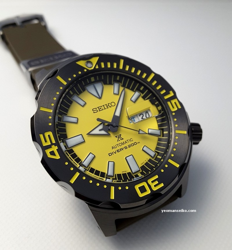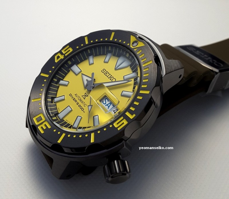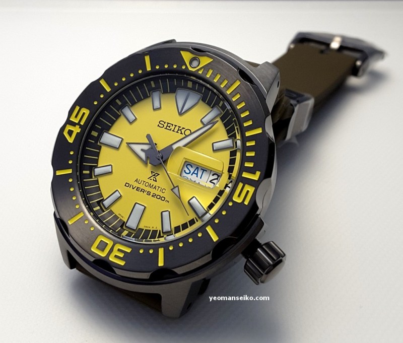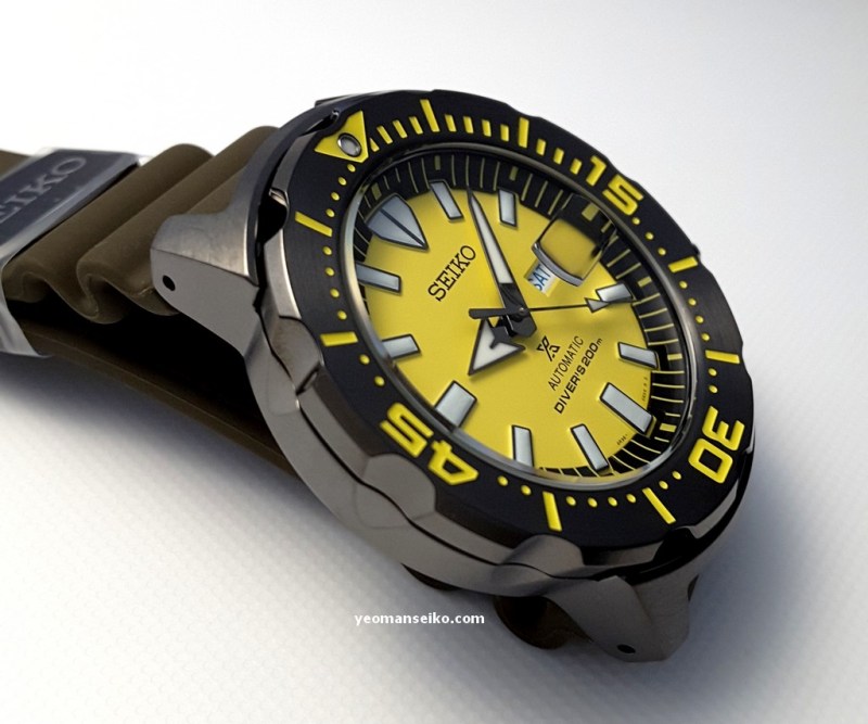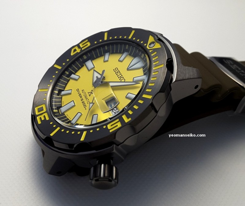 Had the opportunity to check out the latest Seiko Monster, the SRPF35K1. This watch has a black PVD body and a striking yellow dial with black minute chapter ring. It is a Special Edition that comes on an olive green silicon strap and has the words “Special Edition” engraved on its caseback.