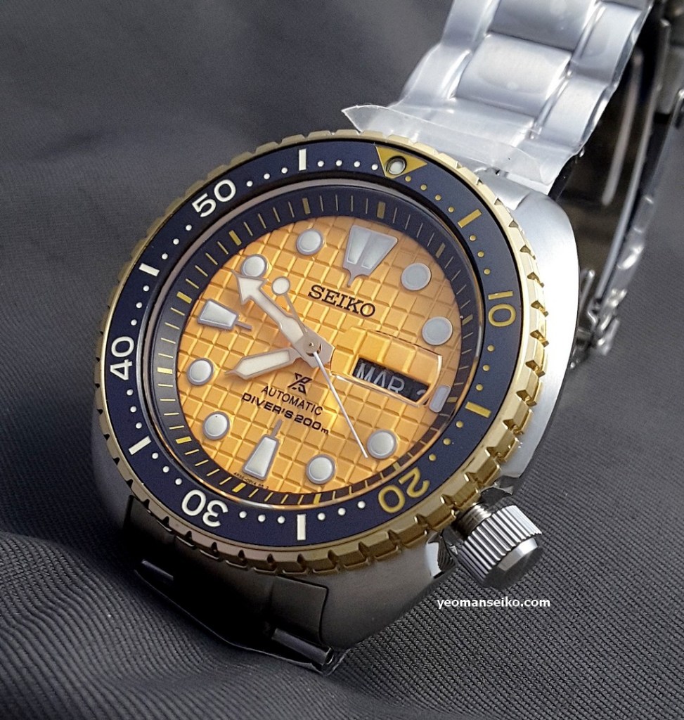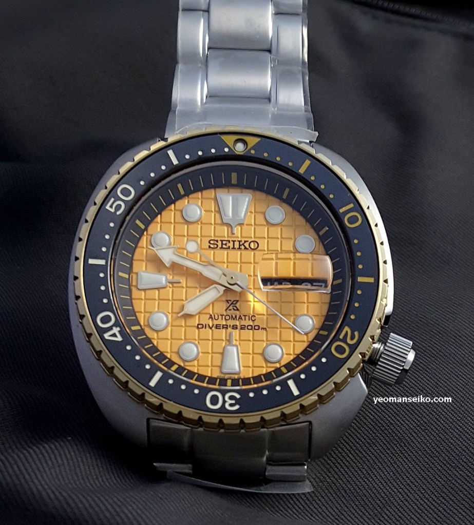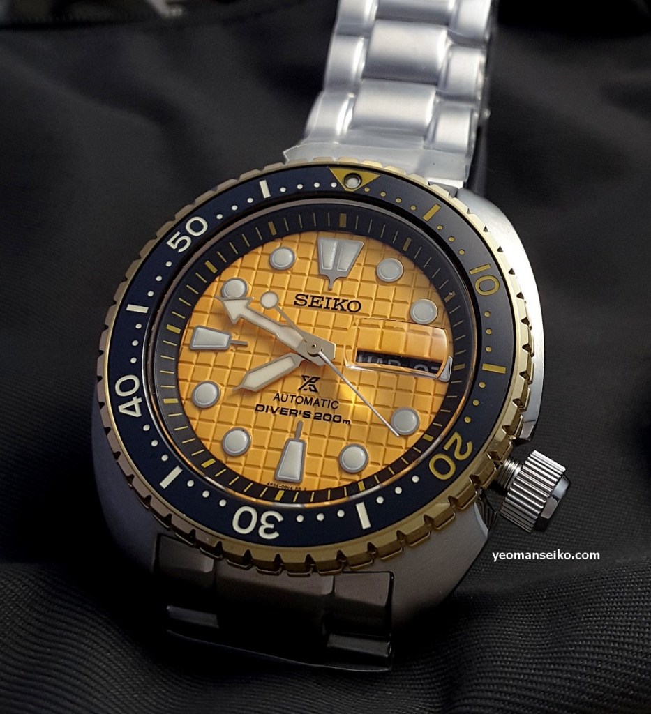 This time round I had the opportunity to handle the Seiko SRPH38K1, a limited edition King Turtle that is created for the Philippine market. The watch is characterized by its bright yellow dial and gold accent on the bezel and bezel insert. The design or rather choice of colours is said to be inspired by the Philippine sunrise and hence it was given the nickname Philippine Sunrise.